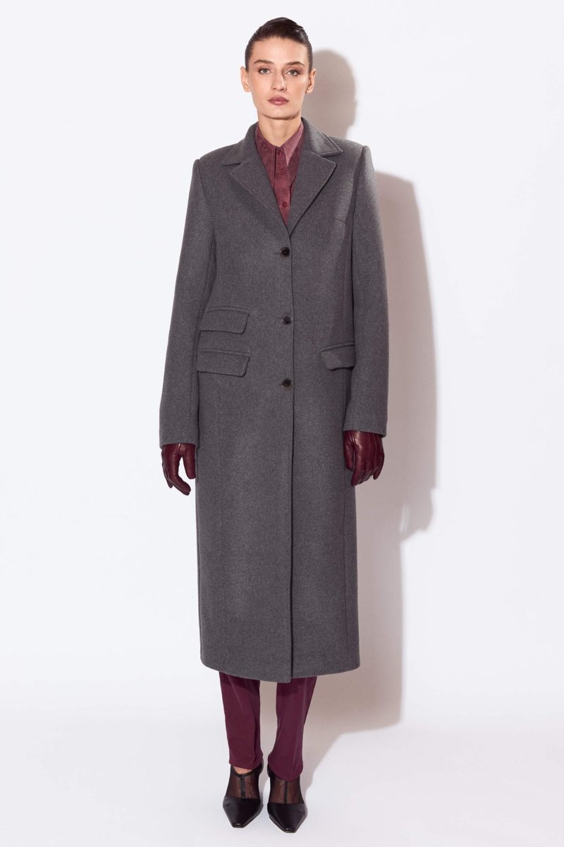 Confectionat din amestec de lana, acest palton combina feminitatea cu o nota masculina. Partea din fata are doua buzunare cu clapeta pe partea dreapta si unul pe partea stanga. Are umerii structurati si talia accentuata.