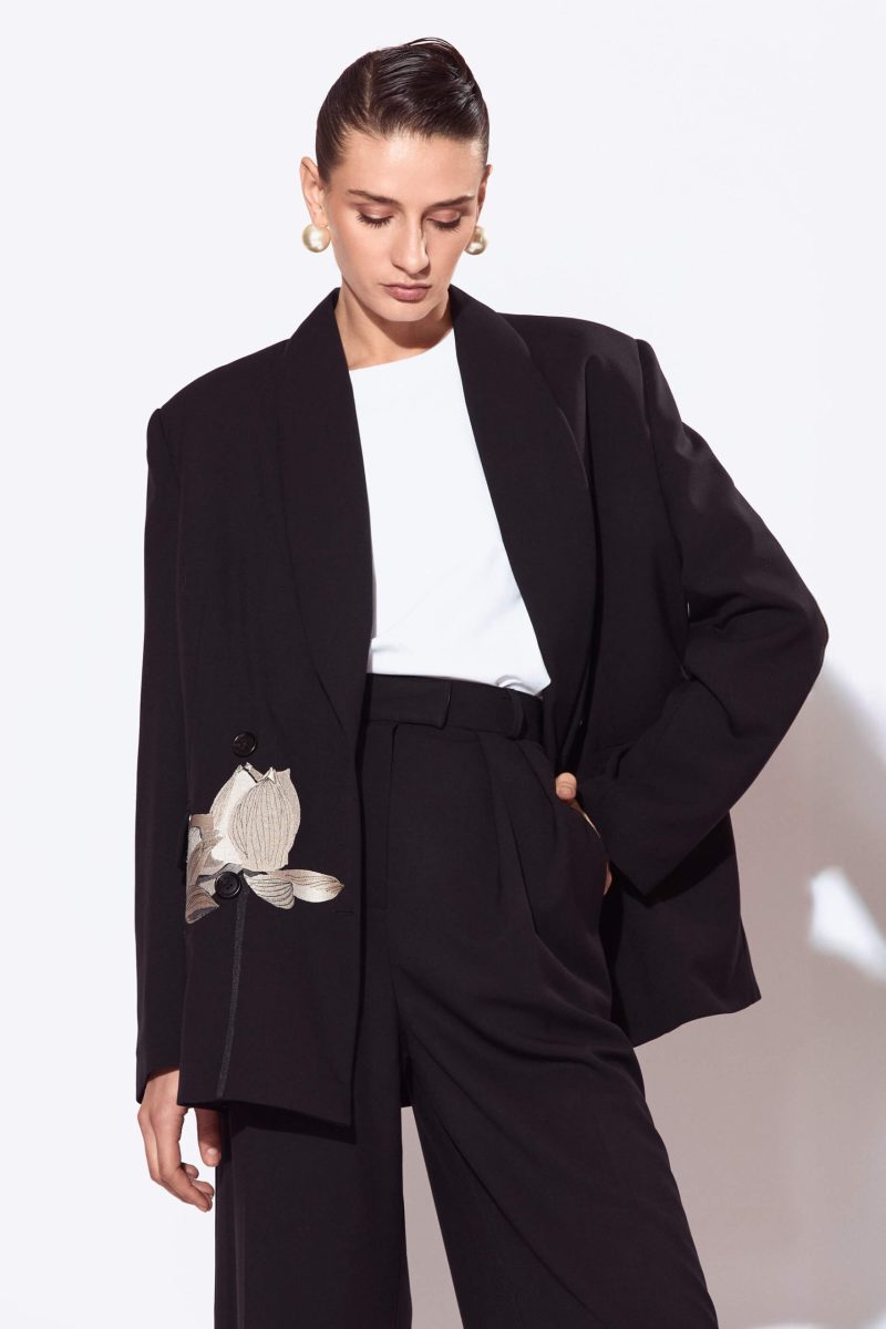 Sacou cu o croiala lejera si guler sal. Are buzunare cu clapeta si umerii evidentiati. Are o broderie eleganta alb-negru cu flori de lotus.