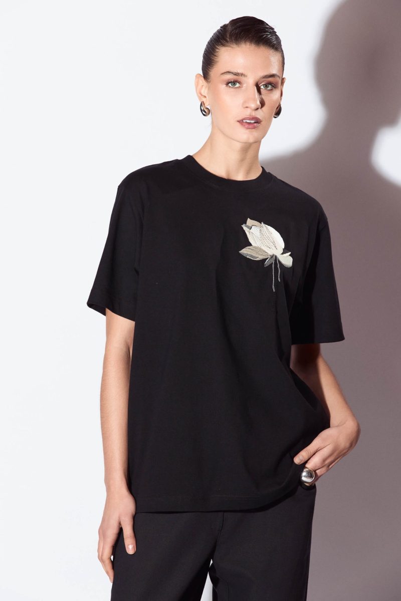 Este greu sa subestimezi versatilitatea unui tricou negru. Acesta este fabricat din bumbac organic si este brodat cu o floare de lotus in nuante neutre. Are un croi usor lejer.
