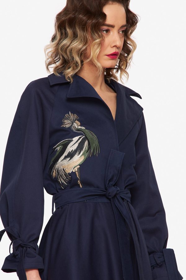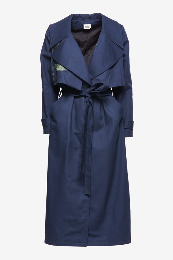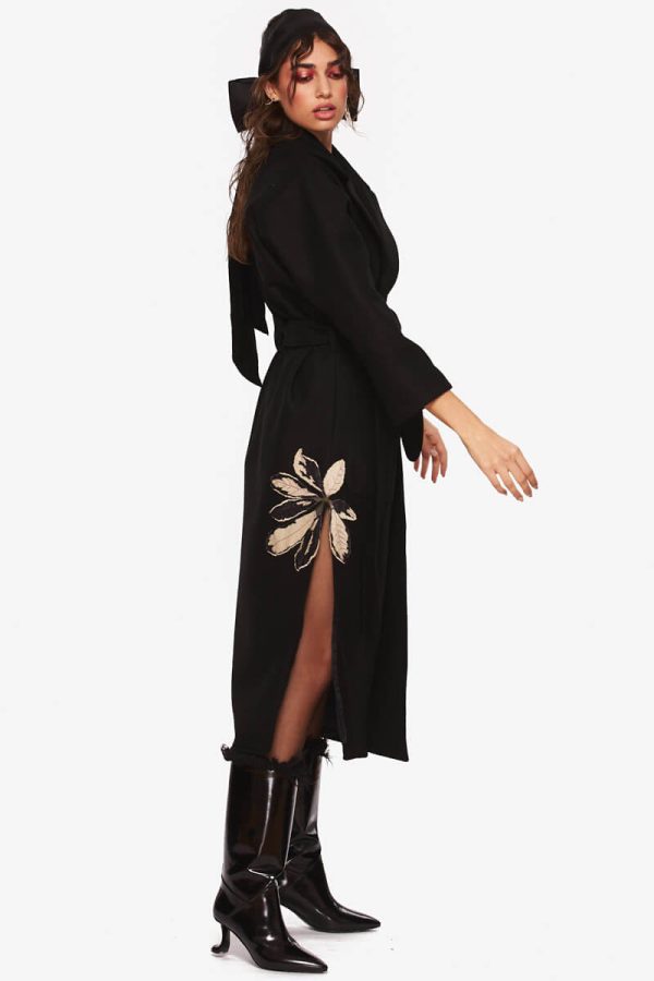 This long black coat features a relaxed, oversized fit with front button closure and a velvet collar. Crafted from hemp, it extends to a maxi lenght. A distinctive white manual embroidery adorns the back and left front side of the coat as well as the hand, adding a unique design element.