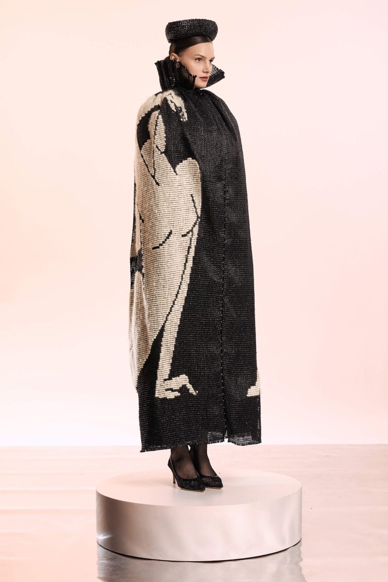 O capa facuta din rafie speciala si cade in forma de cocon, ceea ce confera un aer misterios acestui produs. Este brodata manual cu o silueta alba indrazneata.