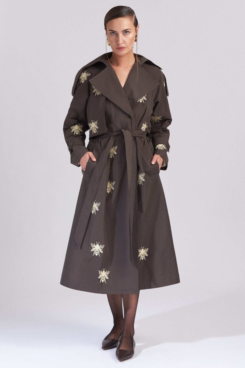 The shell trench has bees embroidered all over, a belt to highlight the waist and pockets.The embroidery is made with golden thread.