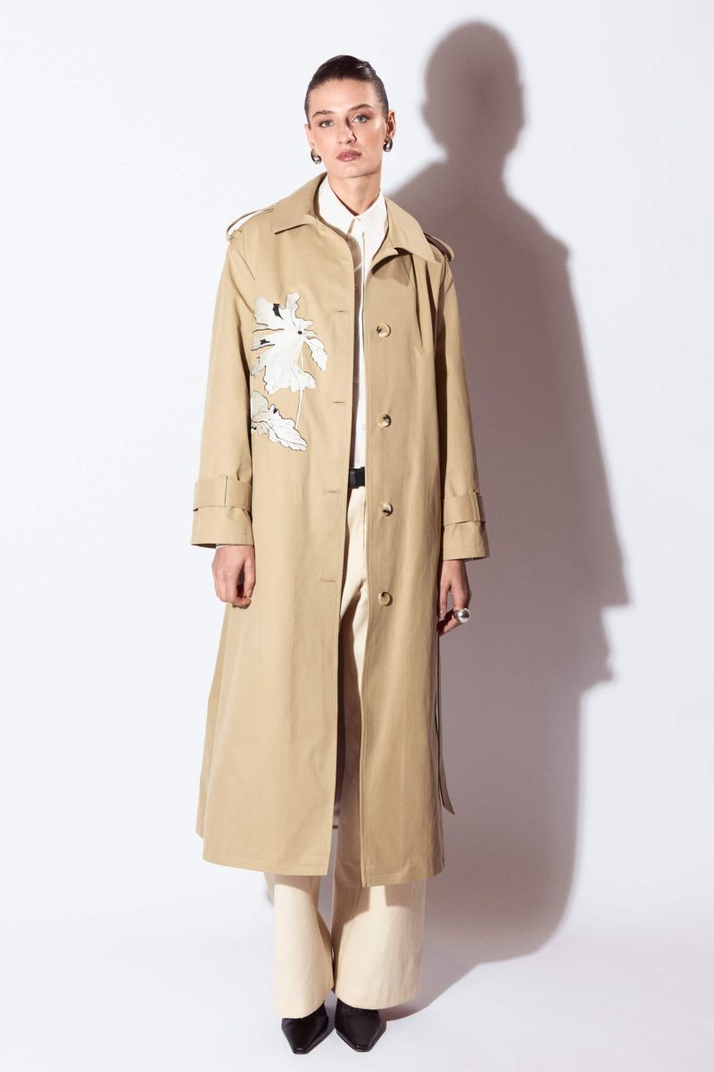 Aceasta piesa vestimentara are un croi relaxat si este confectionata dintr-un material de culoare bej care nu se va demonda niciodata. Are cordon pentru a pune in evidenta talia si broderie alb-negru pe partea dreapta.