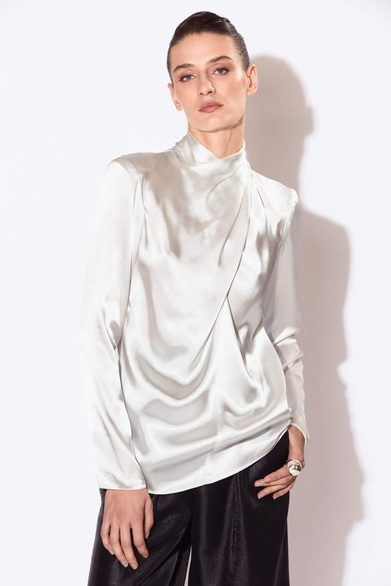 The front of the blouse features a slit in the center seam that continues into a crossover draped detail. Is shaped with shoulder darts and has a center seam at the back. The blouse has a back keyhole opening and a stand collar with a button and rouleau loop closure.
