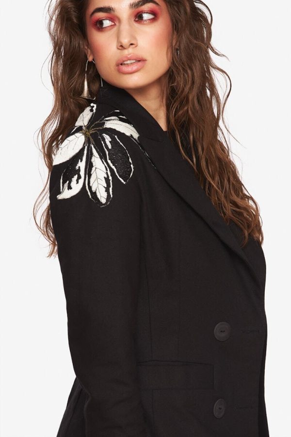 This hand stiched blazer has a timeless, elegant cut with a slightly structured, straight silhouette. It features hand stiches, a