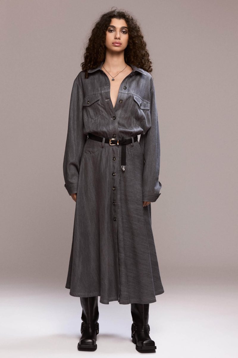Rochie Gri din Denim cu Cusaturi Contrastante