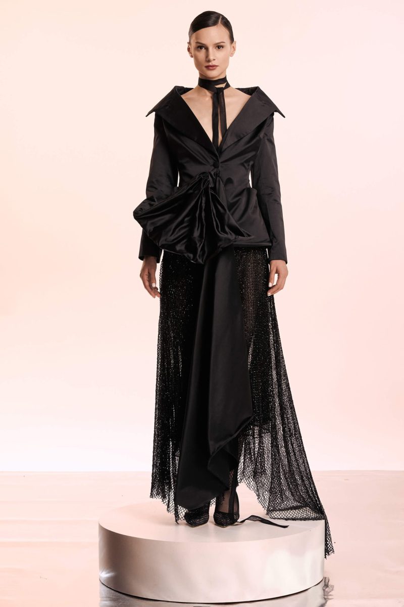 Tailored from mikado, the 60’s style blazer falls gently on the shoulders, revealing the collarbone. It has a bow that goes down from the waist. The black skirt has bead-embellished and a asymmetrical shape.