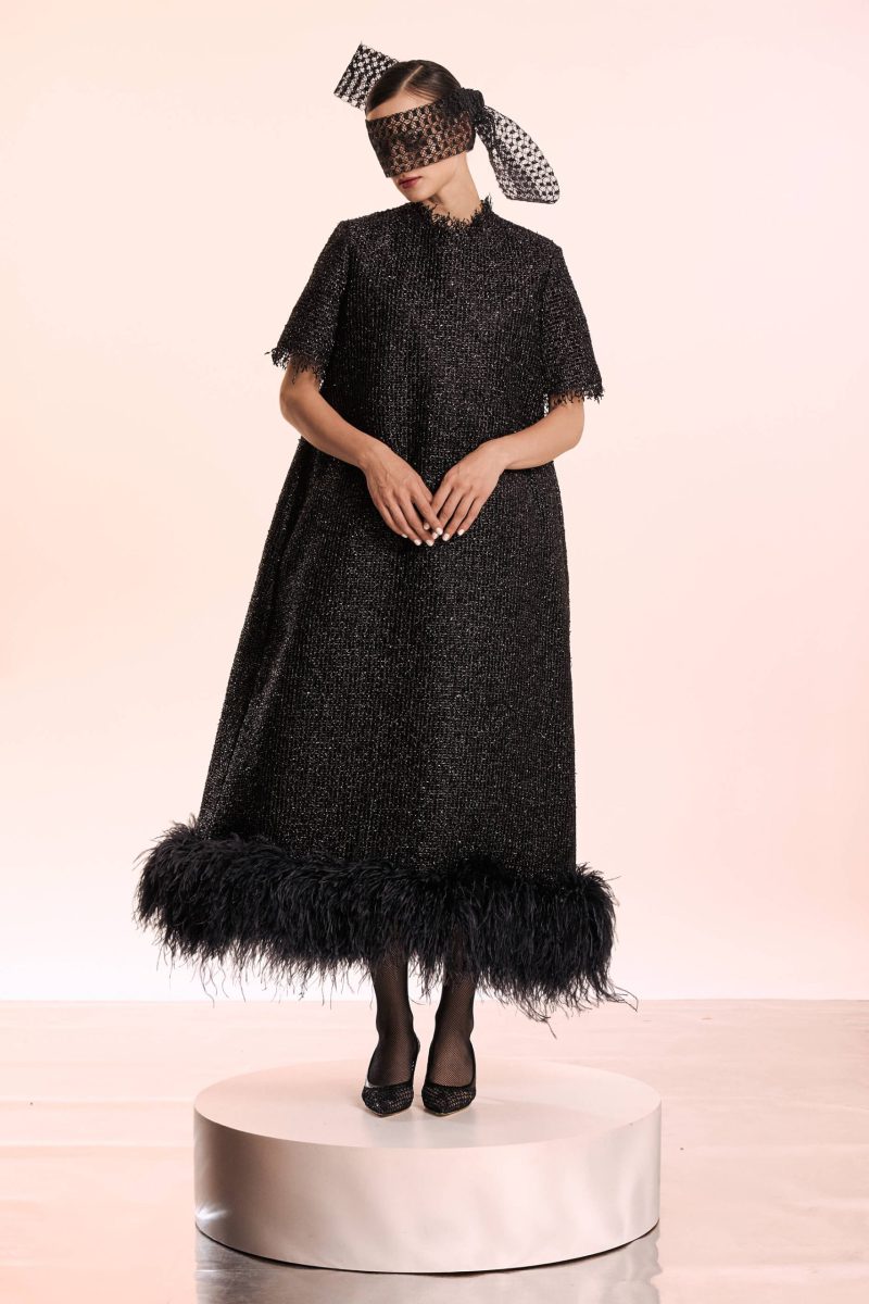 The silver thread inserted into the black fabric make this dress sparkle like a constellation. The A-line shape of the dress is due to the crinoline lining that supports the dress’s harmonious form. At the bottom, it has a finish of luxurious feathers.