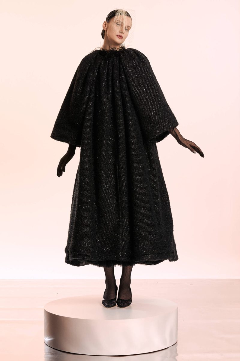 The coat is cut from bucle and has feather finish at the collar. It has vide bell sleeves to create a cape-like effect. On the back it has a hand-made embroidery with a dramatic lily flower in shades of ivory and brick red. It is lined with viscose.